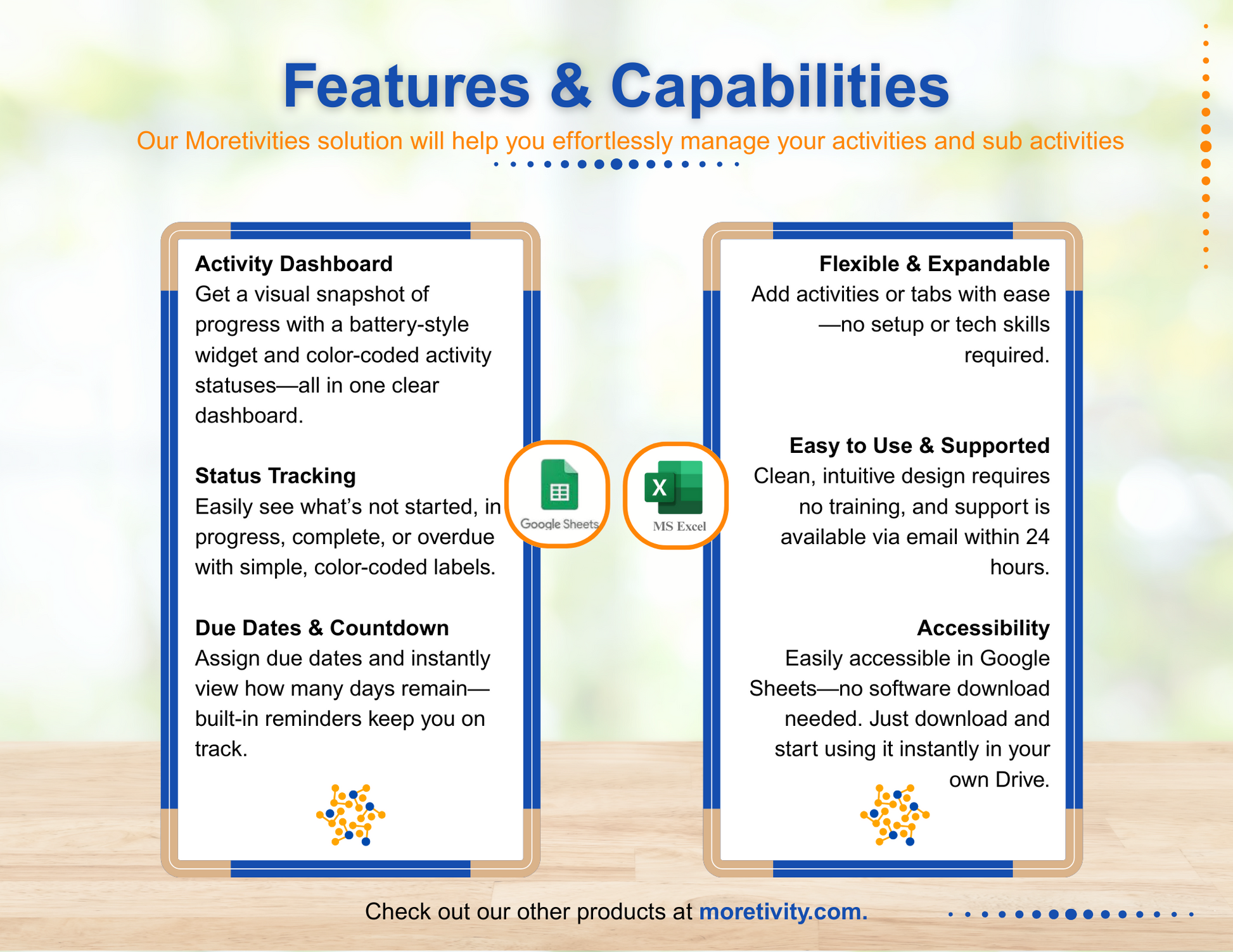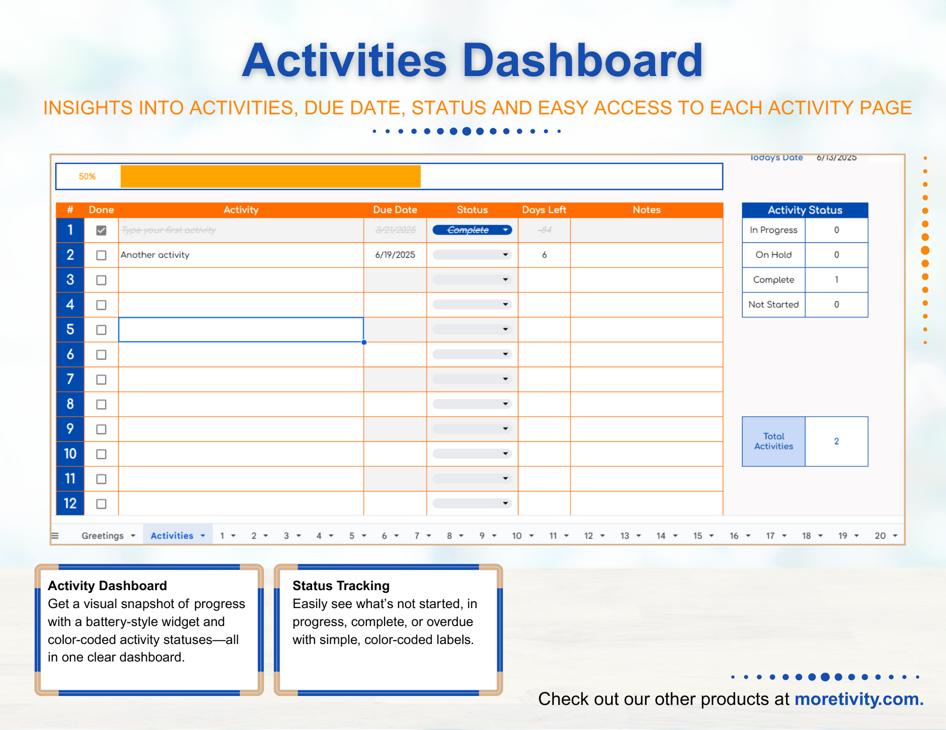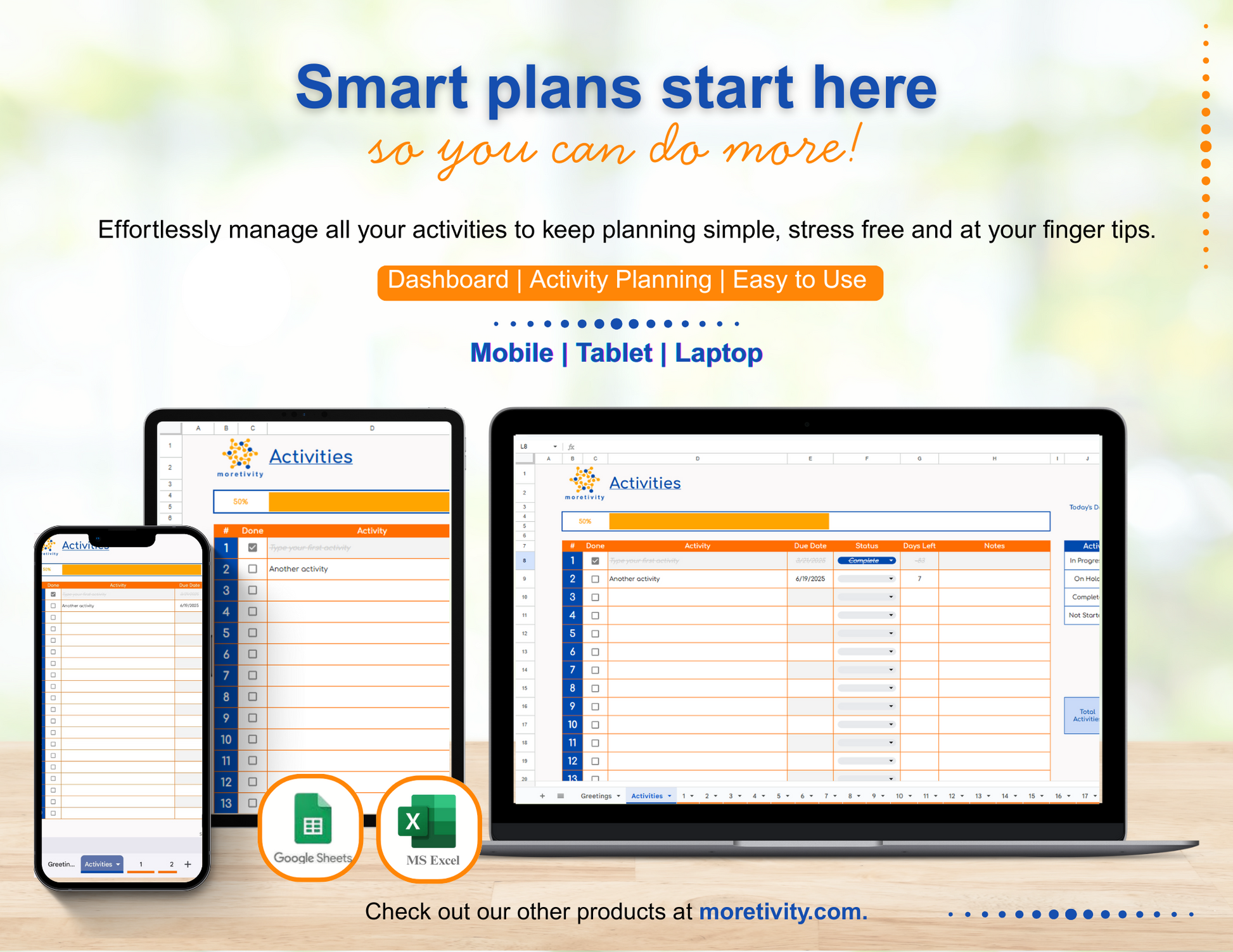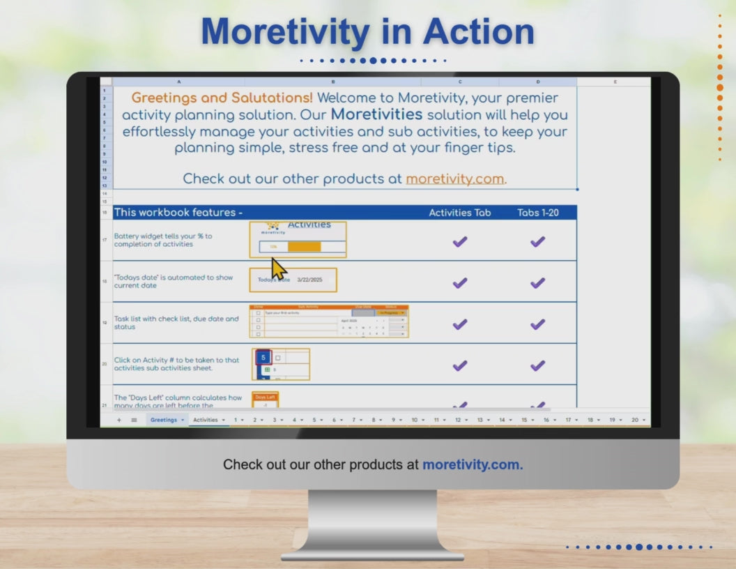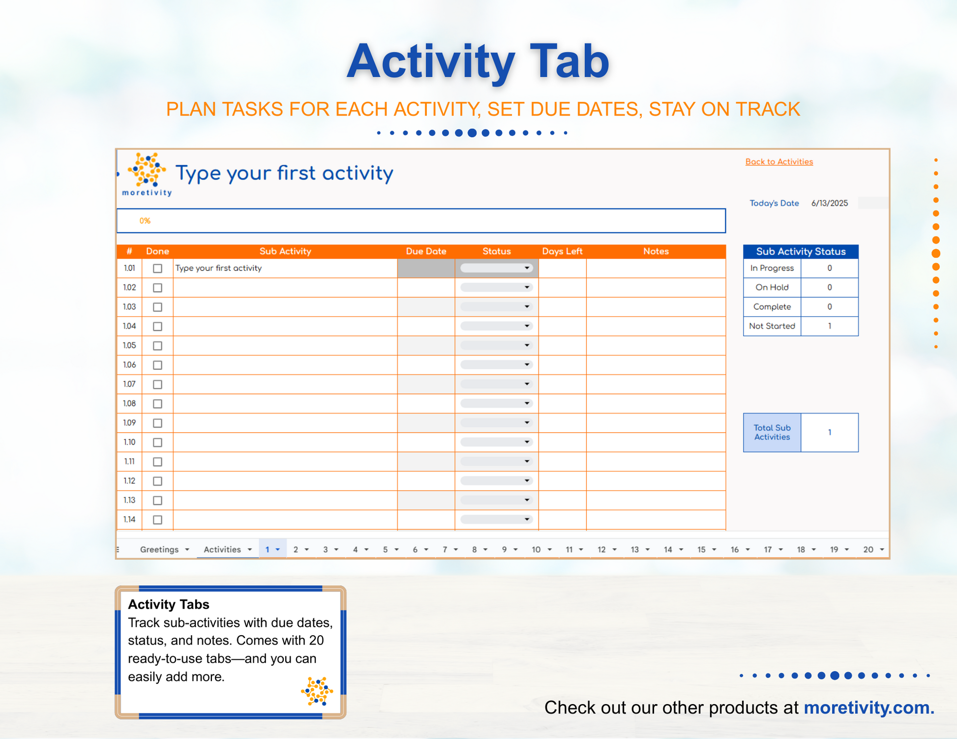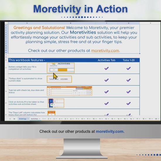 Greetings and Salutations! Welcome to Moretivity, your premier activity planning solution. Our Moretivities solution will help you effortlessly manage your activities and sub activities, to keep your planning simple, stress free and at your finger tips.