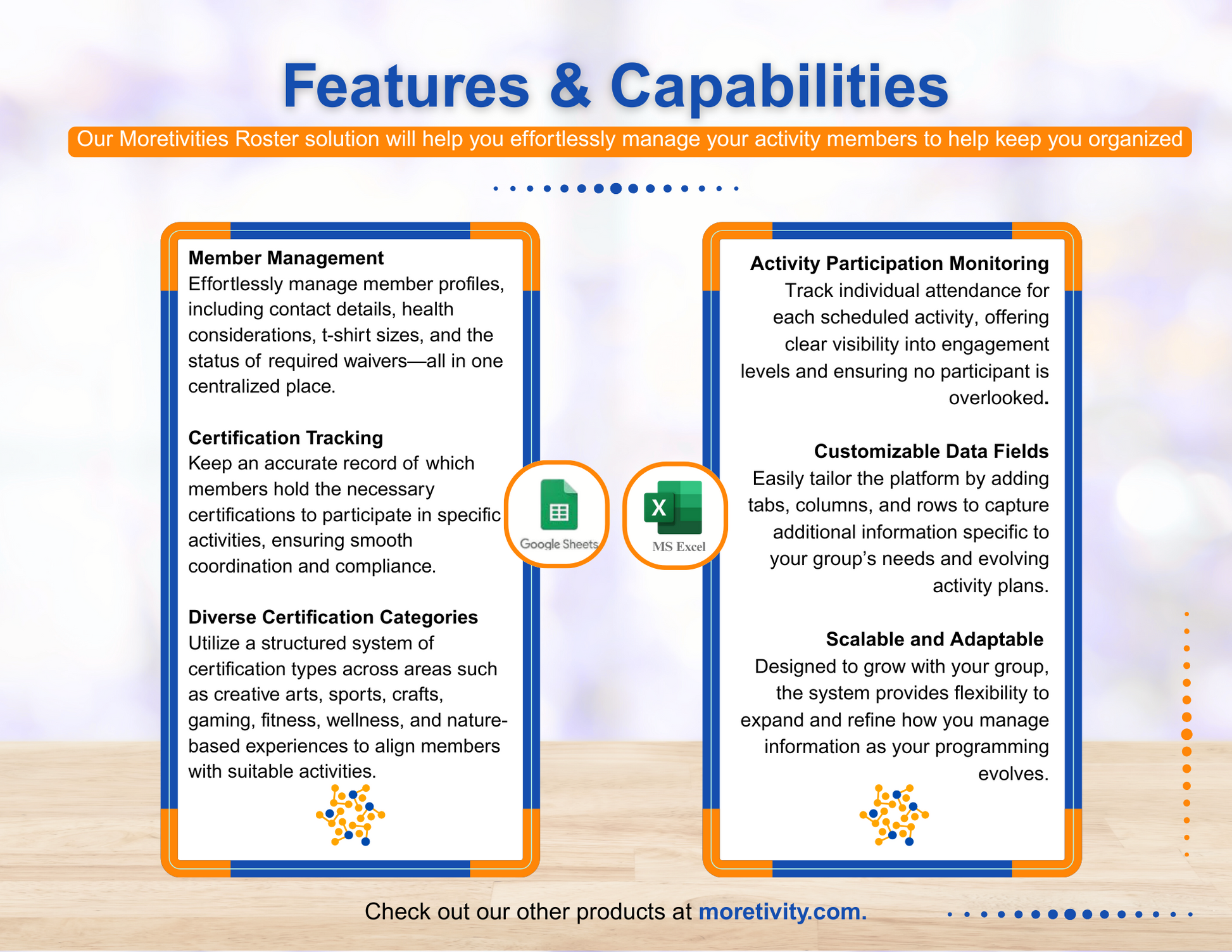 Easily tailor the platform by adding tabs, columns, and rows to capture additional information specific to your group’s needs and evolving activity plans.